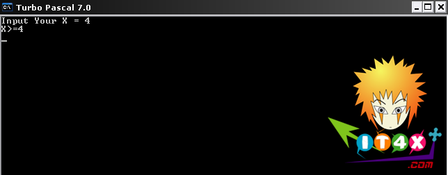 ครั้งแรก ใส่ 4 แล้วมันจะทำตามเงื่อนไข if x>=4 และแสดงผล writeln('X>=4') ตามภาพที่ 2