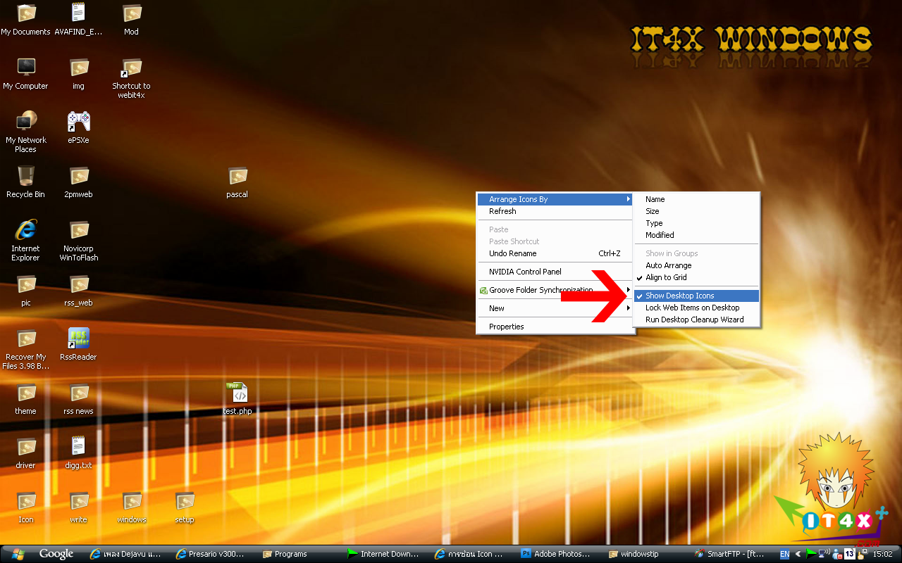 ทิป เทคนิค คอมพิวเตอร์ การซ่อน Icon ที่หน้าจอ ซ่อนเล่น ฮร่าๆ ไม่รู้จะซ่อนทำไมเหมือนกัน Moshi 16,996 โพสต์ · สมาชิกตั้งแต่ 4 กรกฎาคม 2552 📅 6 สิงหาคม 2552 เวลา 11:46 น. 👁 8,194 ครั้ง · 💬 0 ตอบ การซ่อน Icon ที่หน้าจอ ซ่อนเล่น ฮร่าๆ ไม่รู้จะซ่อนทำไมเหมือนกัน ให้คลิกขวาที่ว่างๆตรงหน้าจอแล้วเลือก Arrange Icons By>Show Desktop Icons แล้วจะได้แบบภาพ ง่ายไหม อิอิ วิธีเอากลับมาก็ทำแบบเดิมครับผม Credit : www.it4x.com