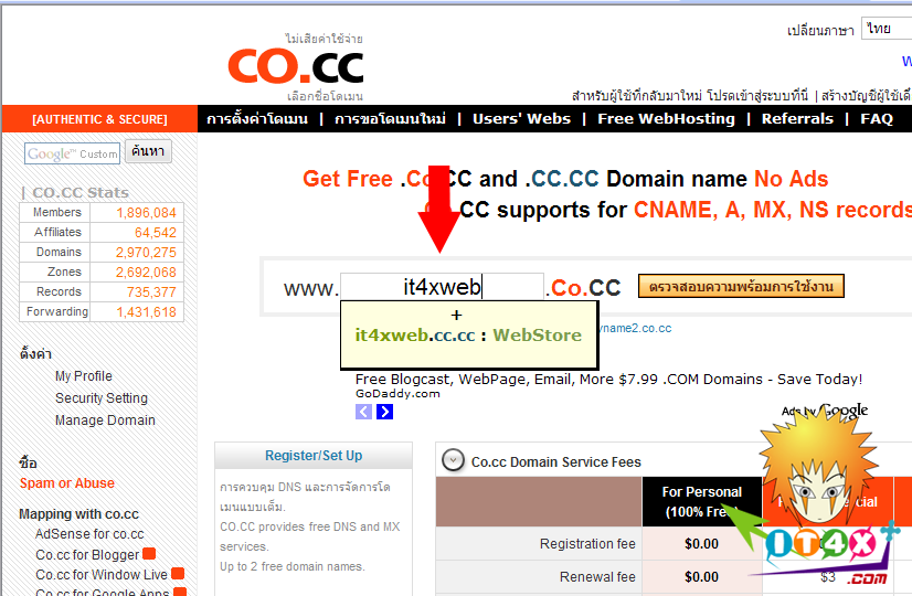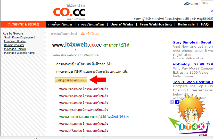 ขั้นตอนแรกเข้าสู้เว็ป www.co.cc ครับผม จากนั้น กรอกชื่อที่เราต้องการจะใช้ครับ เช่น it4xweb.co.cc แล้วกดตรวจสอบความพร้อมใช้งานครับ