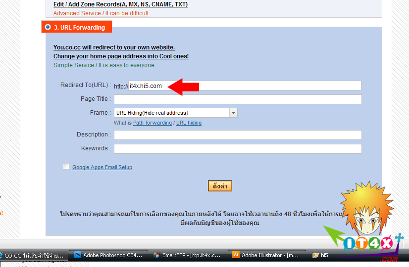 หลังจากที่เข้ามาแล้วเลือกที่ช่อง Url forward แล้วใส่ลิงค์ hi5 เราจริงๆ แล้วกดตั้งค่าครับ