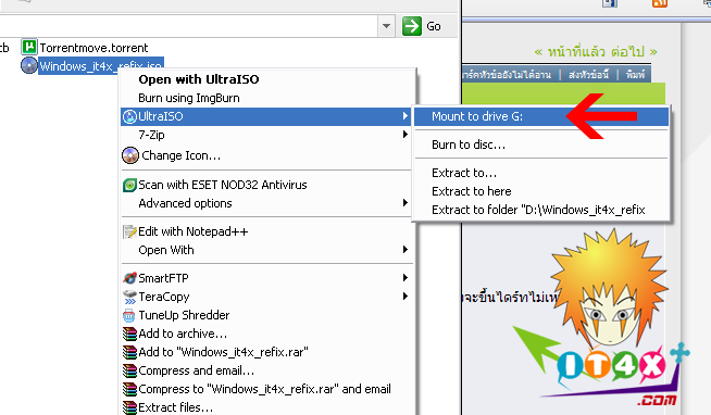 ให้ไปที่ไฟล์ที่ต้องการจะจำลองนะครับแล้วคลิกขวาเลือก Ultaiso>Mount To :  แต่ละเครื่องจะขึ้นไดร์ทไม่เหมือนกันนะครับ